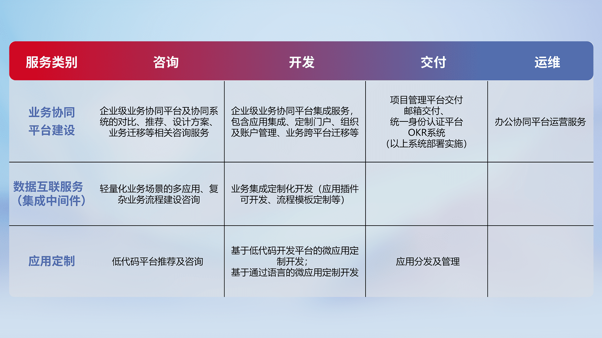针对钉钉、、企微、、IDaas等平台级产品提供产品的规划、、、方案、、、、交付、、、、定制化开发等服务,,,实现如统一协同办公、、、智能客户服务、、、、混合会议管理、、、智能数据查询、、、、等业务场景,,,,实现数字化转型。。。。
